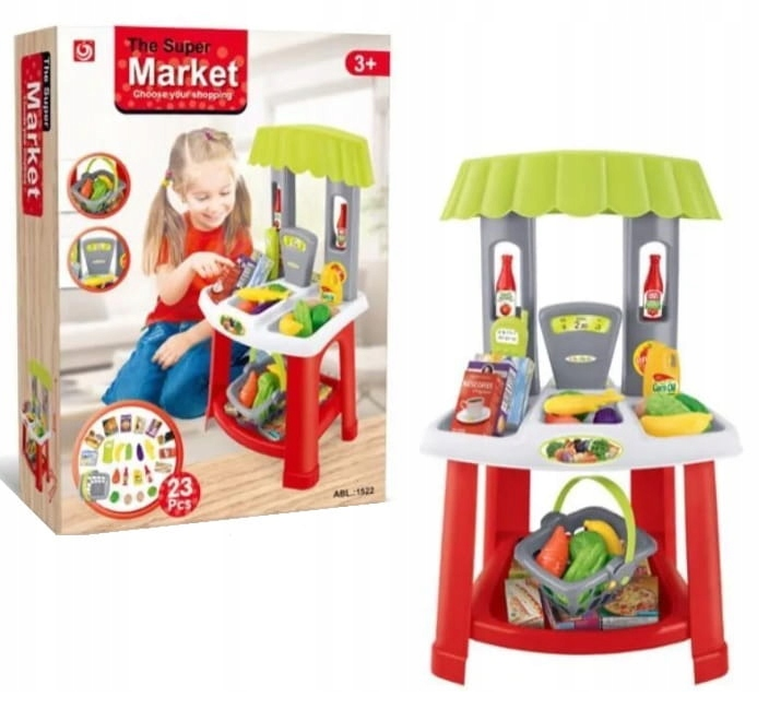 To przede wszystkim lada z małym okienkiem. Dodatkowo do zestawu dołączono wagę, koszyki na zakupy, cennik oraz produkty takie jak: warzywa, owoce, mleko i cukier. Wszystko wykonane z najwyższej jakości plastiku, co gwarantuje trwałość i bezpieczeństwo podczas użytkowania.